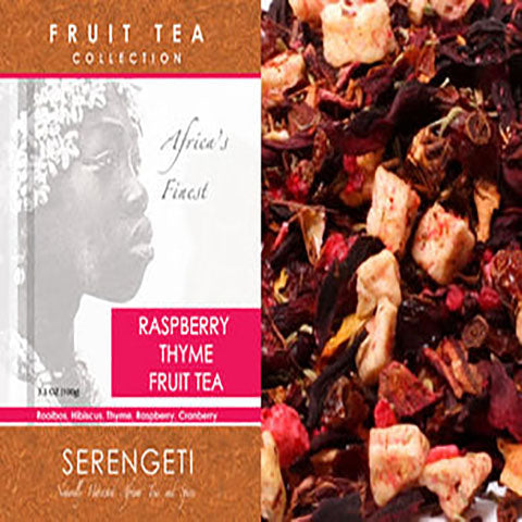 A Raspberry, Hibiscus and Thyme tea made with naturally harvested organic raspberry, organic hibiscus flowers, organic thyme, that brews an uplifting and succulent fruity raspberry cup of tea. A rather delicious raspberry taste from the whole dry raspberries used. The flavor of the thyme is just right. The two flavors take you on a flight of tea enjoyment.